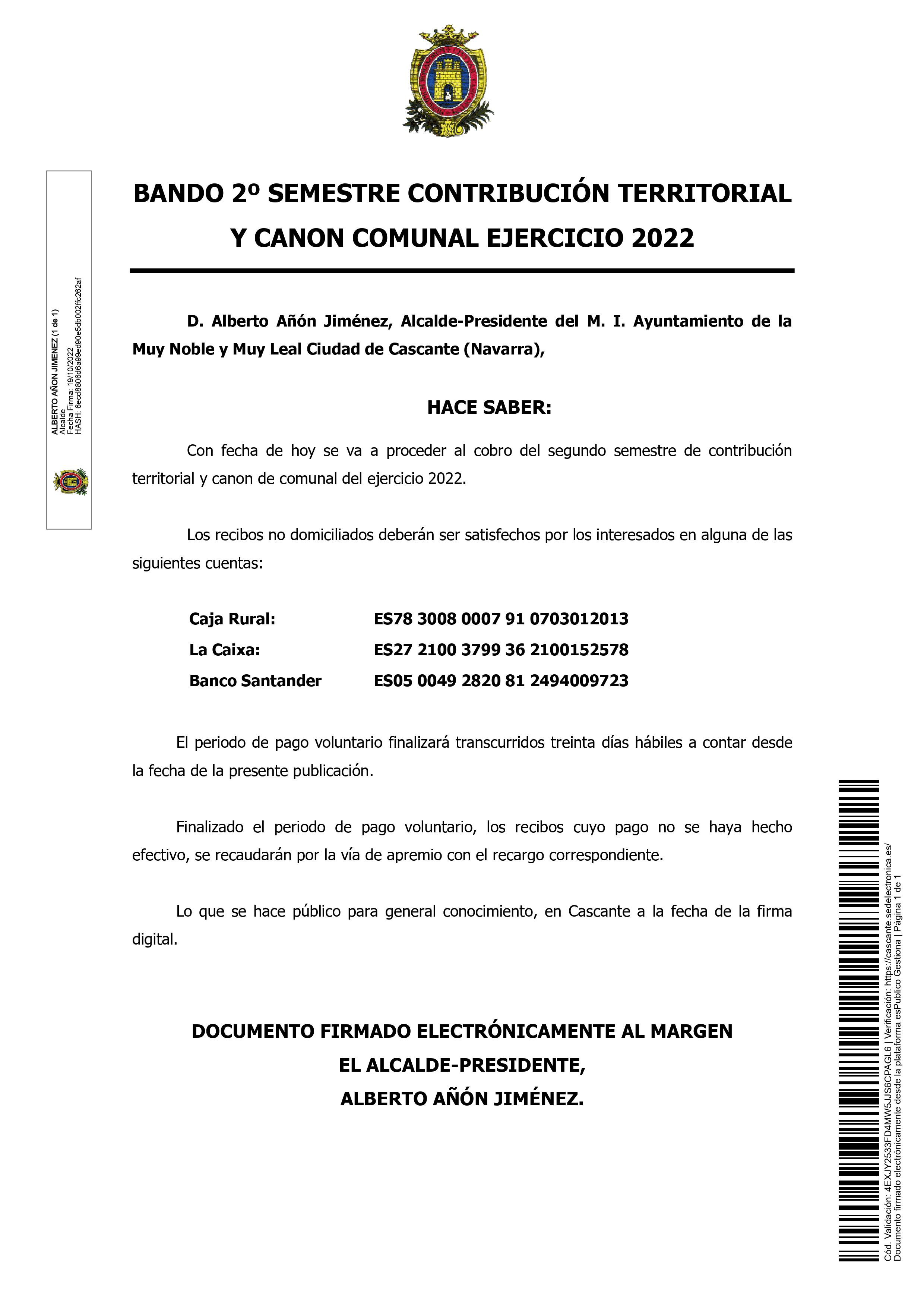 BANDO 2º SEMESTRE CONTRIBUCIÓN TERRITORIAL Y CANON COMUNAL EJERCICIO 2022