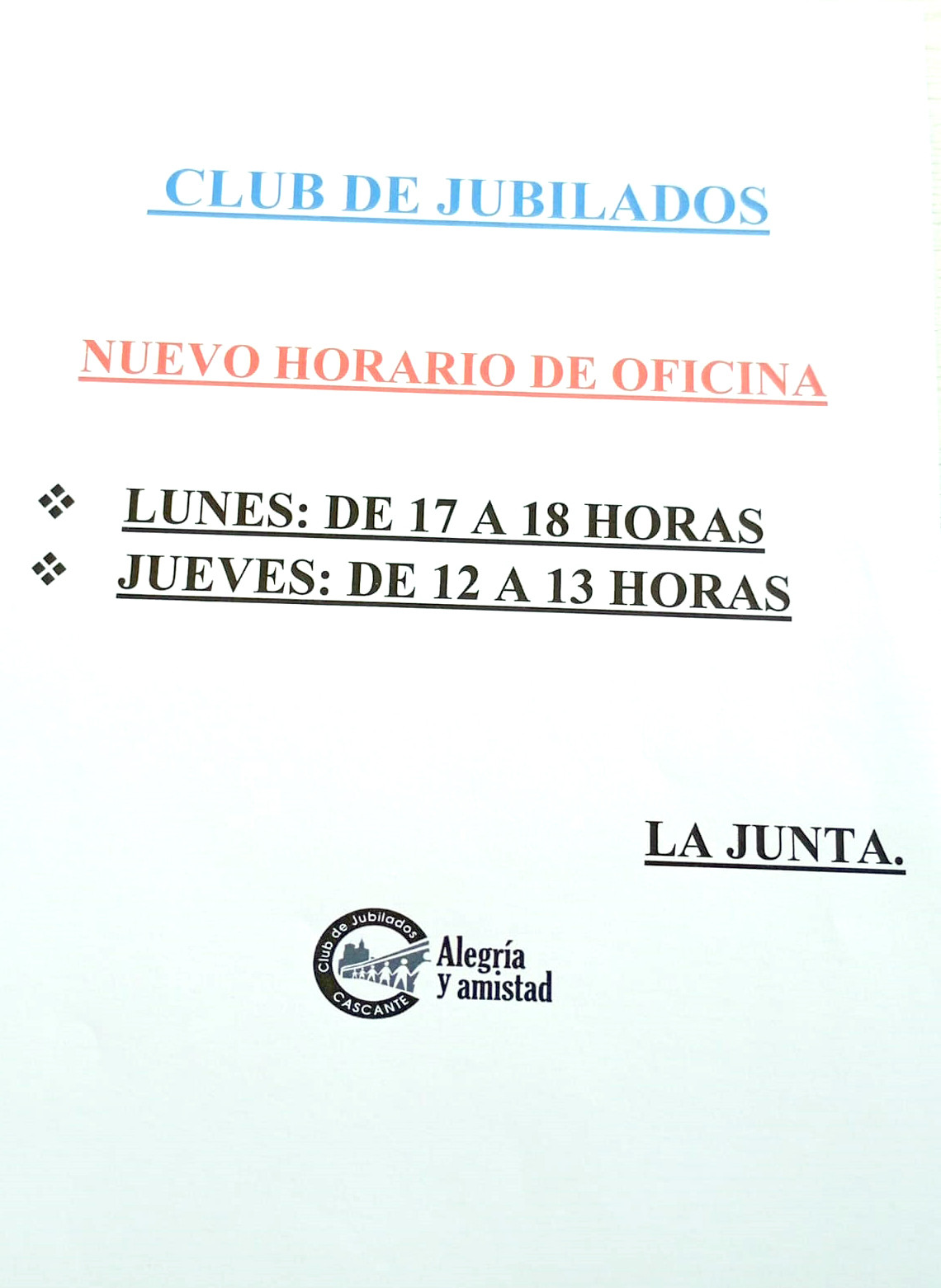 CLUB DE JUBILADOS: NUEVO HORARIO DE OFICINA