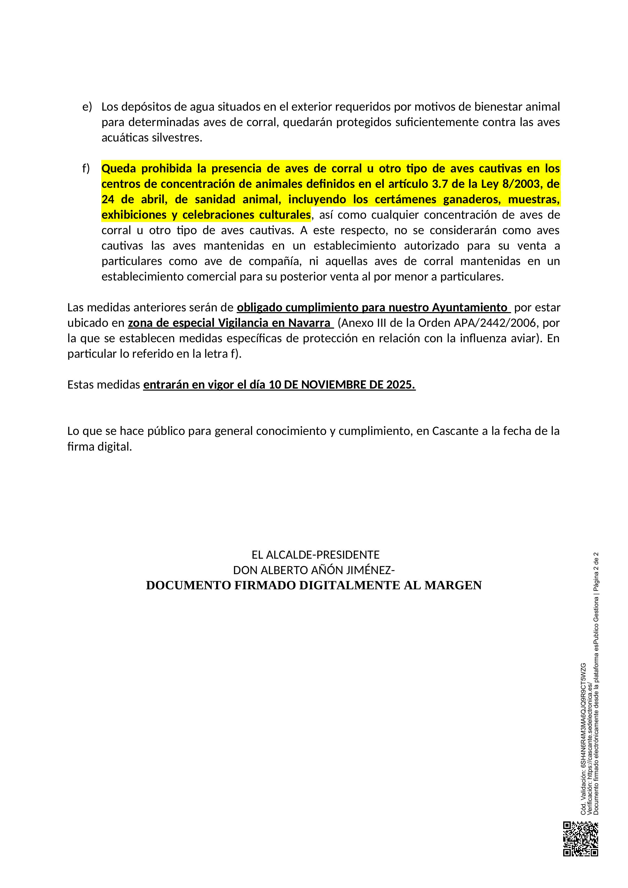 Las medidas anteriores serán de obligado cumplimiento para nuestro Ayuntamiento por estar ubicado en zona de especial Vigilancia en Navarra (Anexo III de la Orden APA/2442/2006, por la que se establecen medidas específicas de protección en relación con la influenza aviar). En particular lo referido en la letra f).