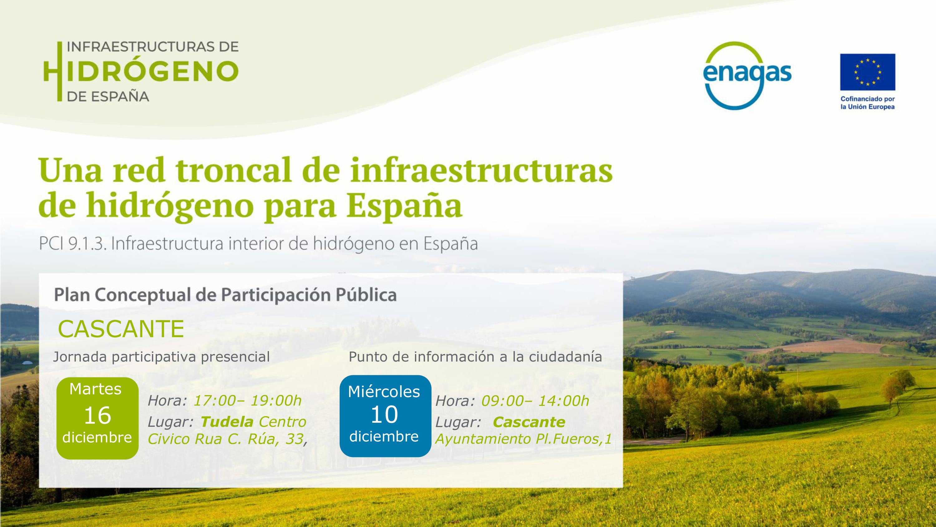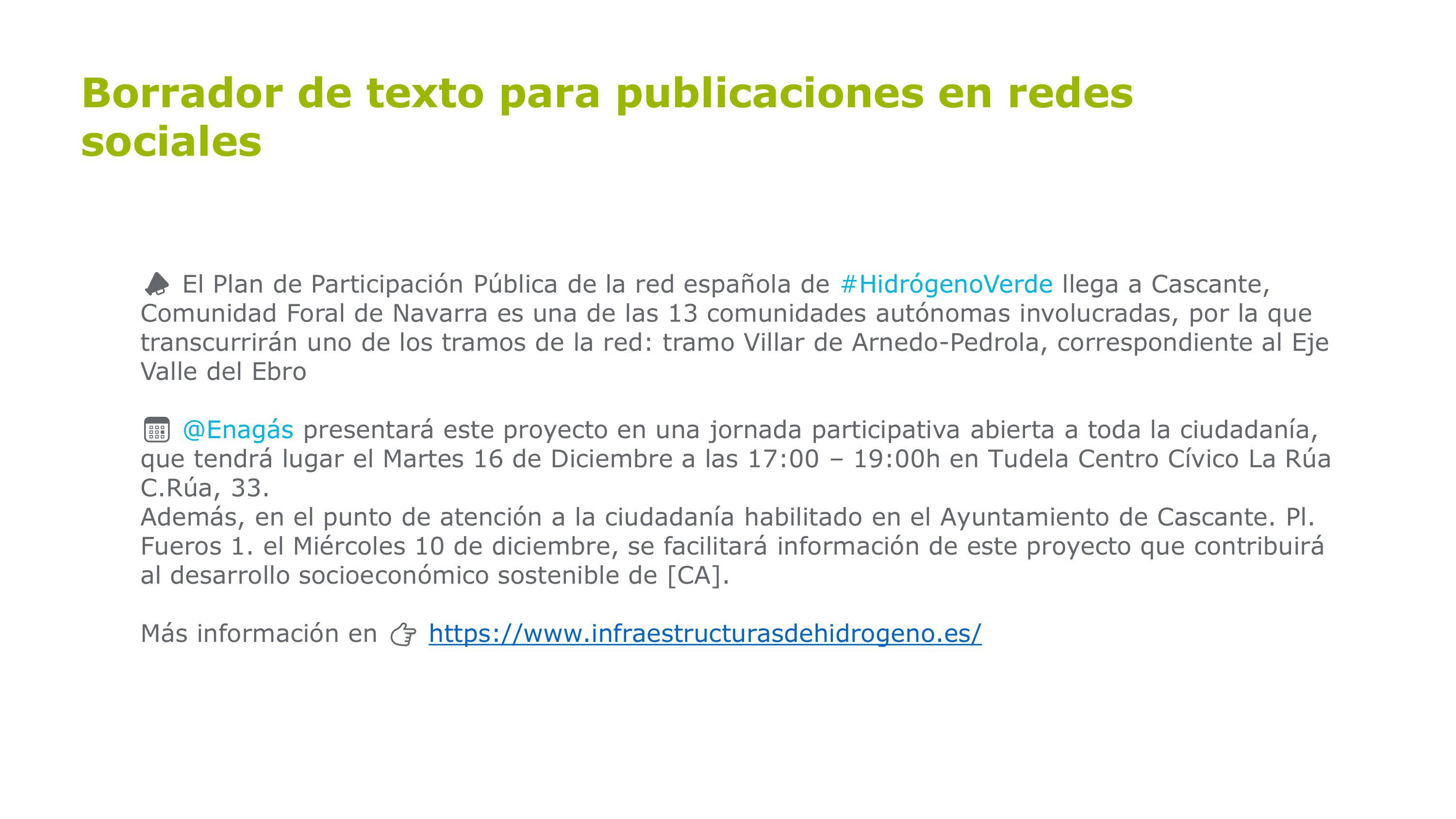 El Plan de Participación Pública de la red española de #HidrógenoVerde llega a Cascante, Comunidad Foral de Navarra es una de las 13 comunidades autónomas involucradas, por la que transcurrirán uno de los tramos de la red: tramo Villar de Arnedo-Pedrola, correspondiente al Eje Valle del Ebro.