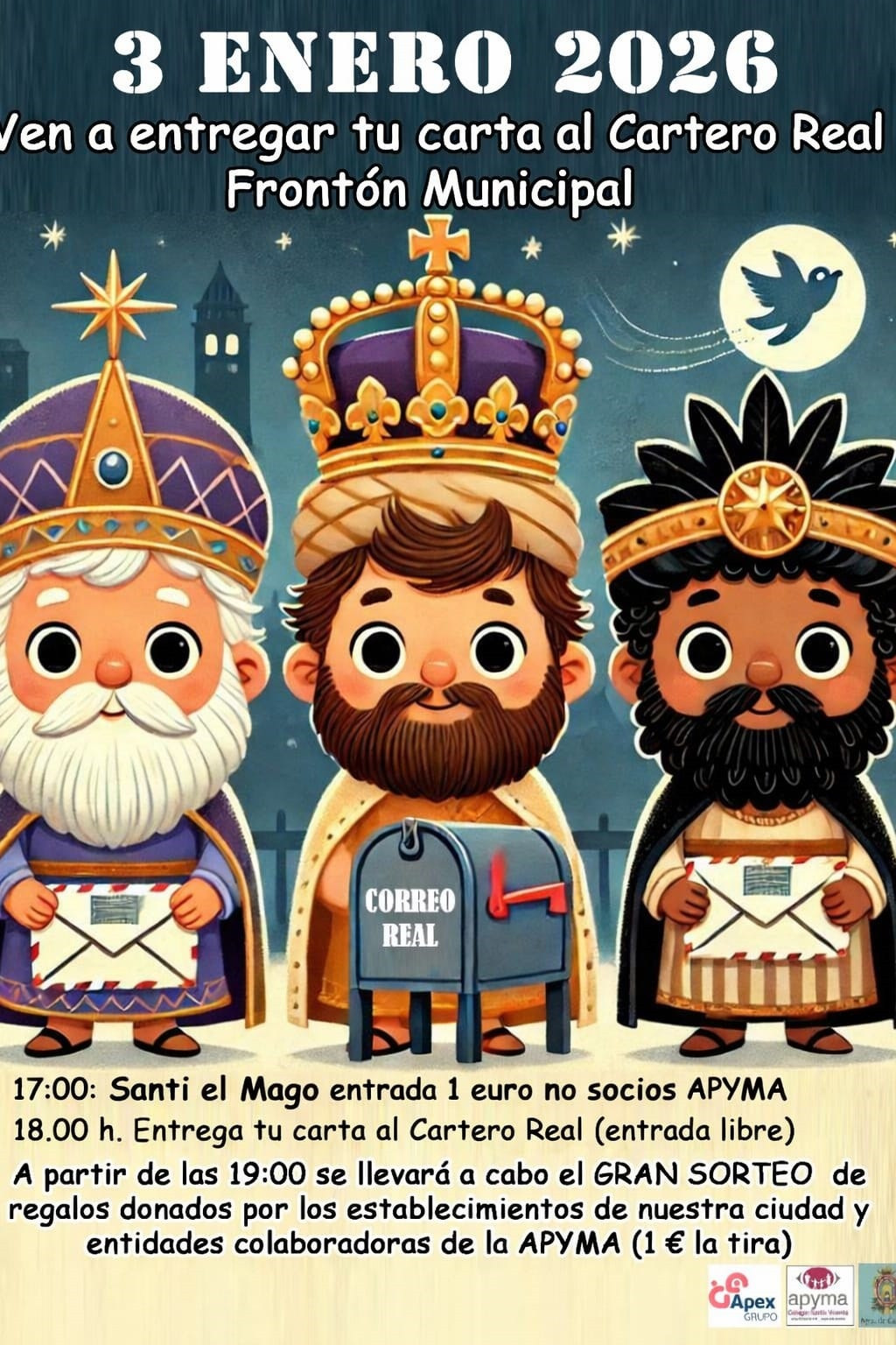 Santi el Mago a las 17:00 horas y Cartero Real a partir de las 18:00 horas. Sorteo de regalos a partir de las 19:00 horas.
