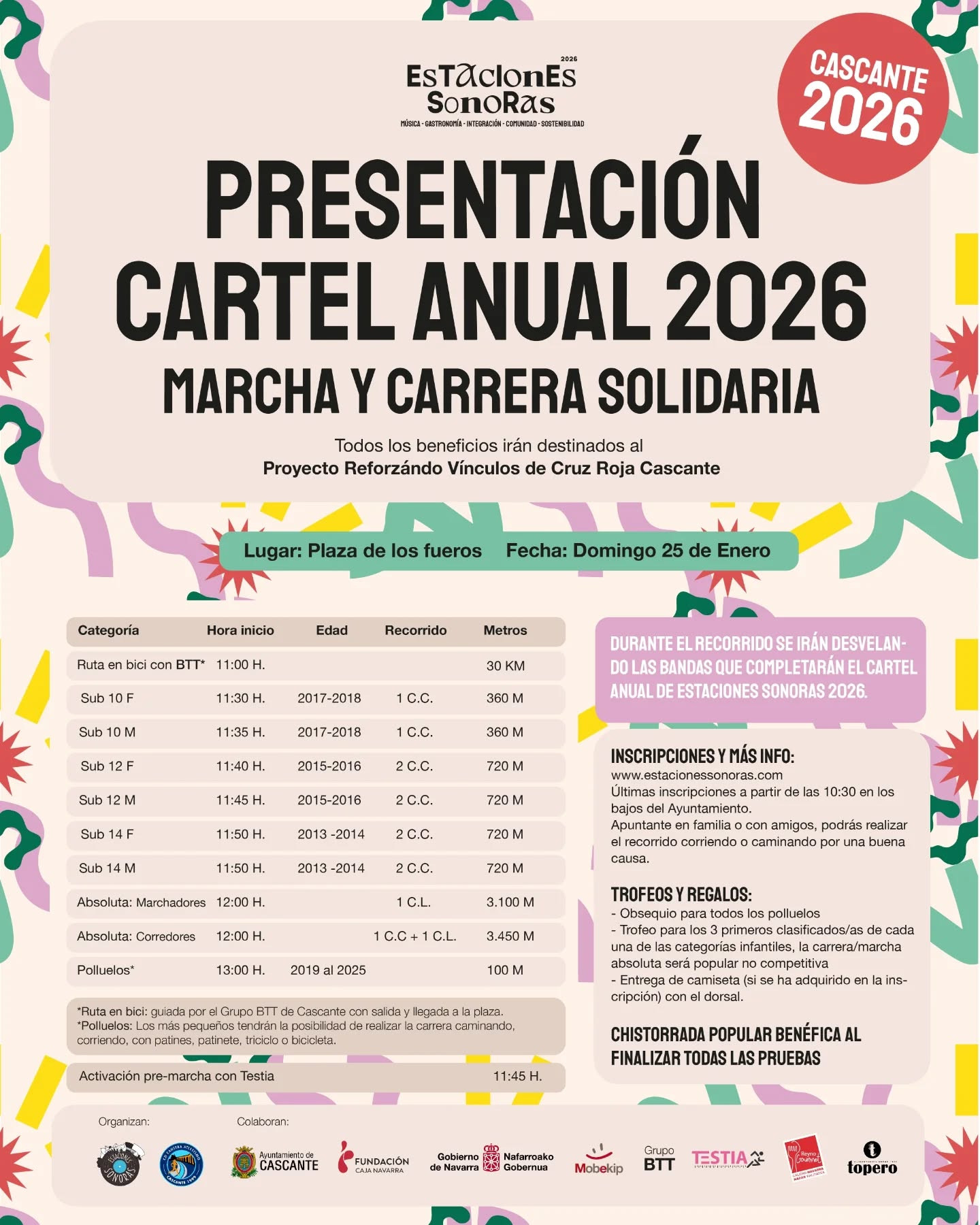 Os invitamos a participar en una prueba atlética benéfica que organizamos de la mano de C.D. Cantera, en la que recorreremos Cascante... ¡y en la que desvelaremos los artistas que disfrutaremos en "Estaciones 2026" a lo largo de varios puntos del recorrido de la prueba!