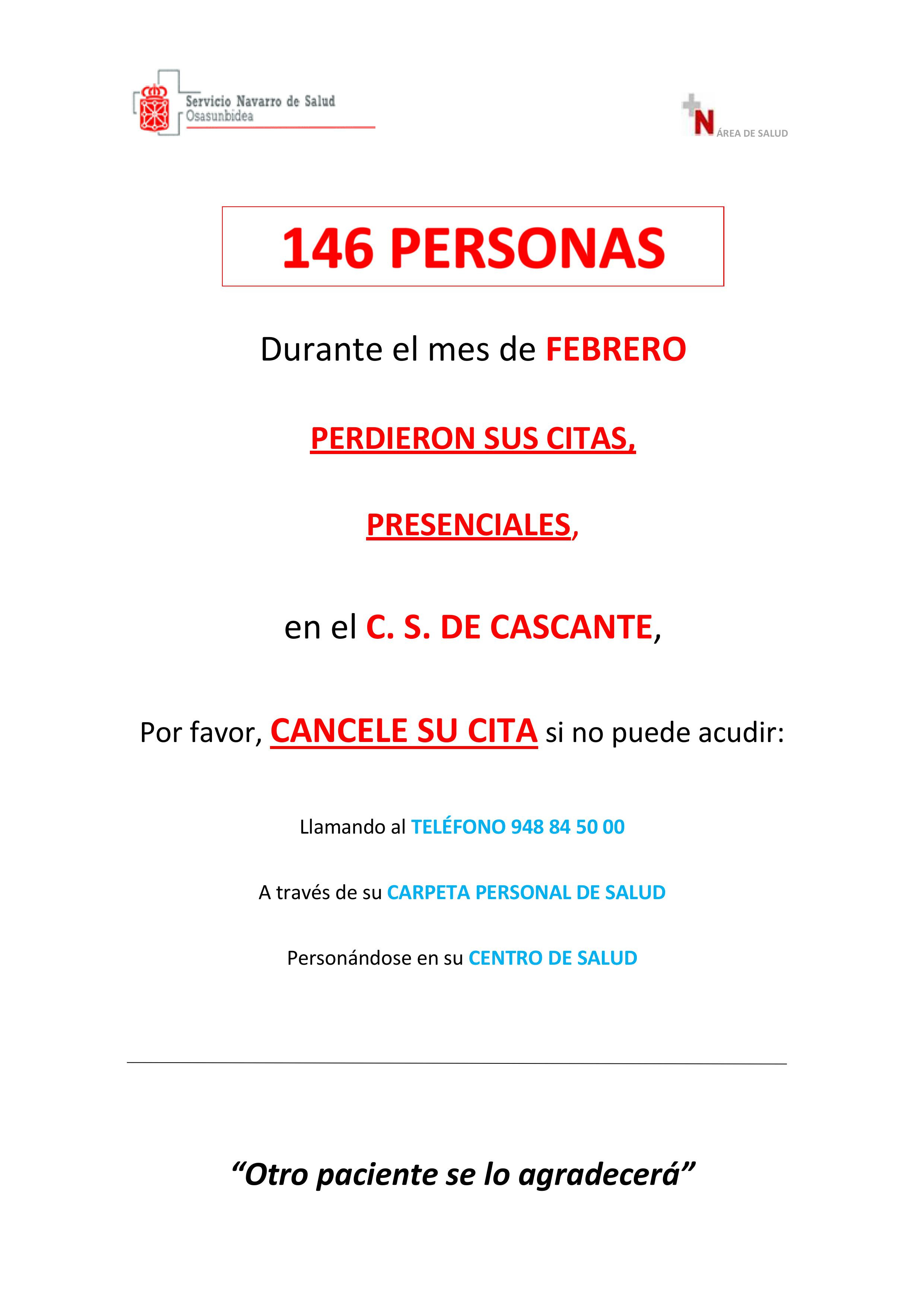 Durante el mes de FEBRERO, 146 PERSONAS PERDIERON SUS CITAS PRESENCIALES, en el Cons. DE CASCANTE.