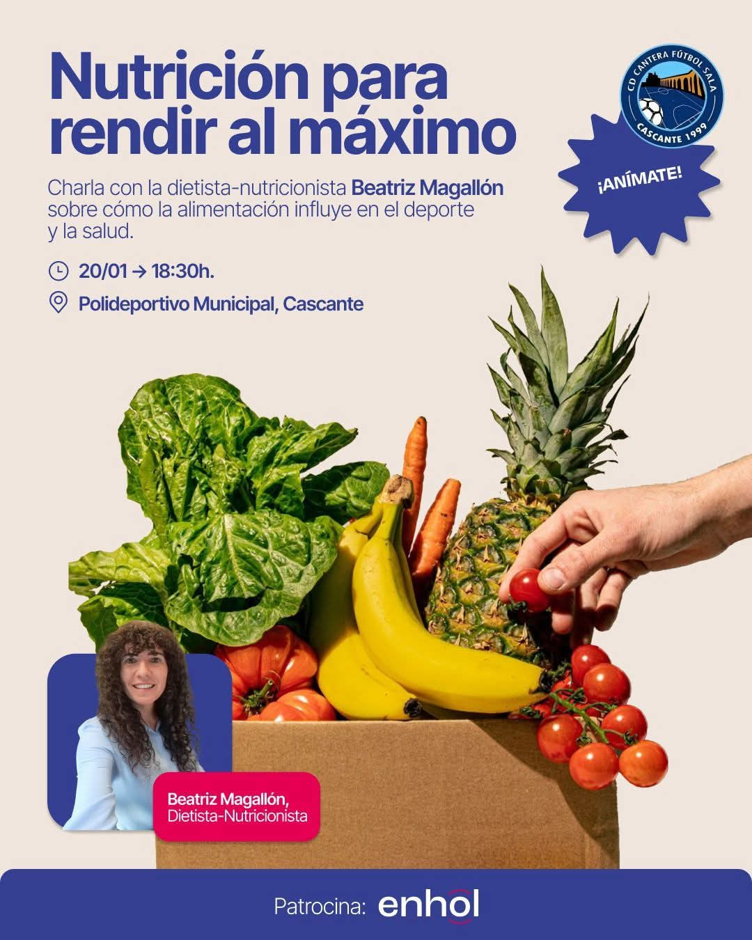 Os invitamos a la charla “Nutrición para rendir al máximo”, impartida por la dietista-nutricionista Beatriz Magallón, donde aprenderemos cómo la alimentación influye directamente en vuestro rendimiento deportivo, la recuperación y la salud.