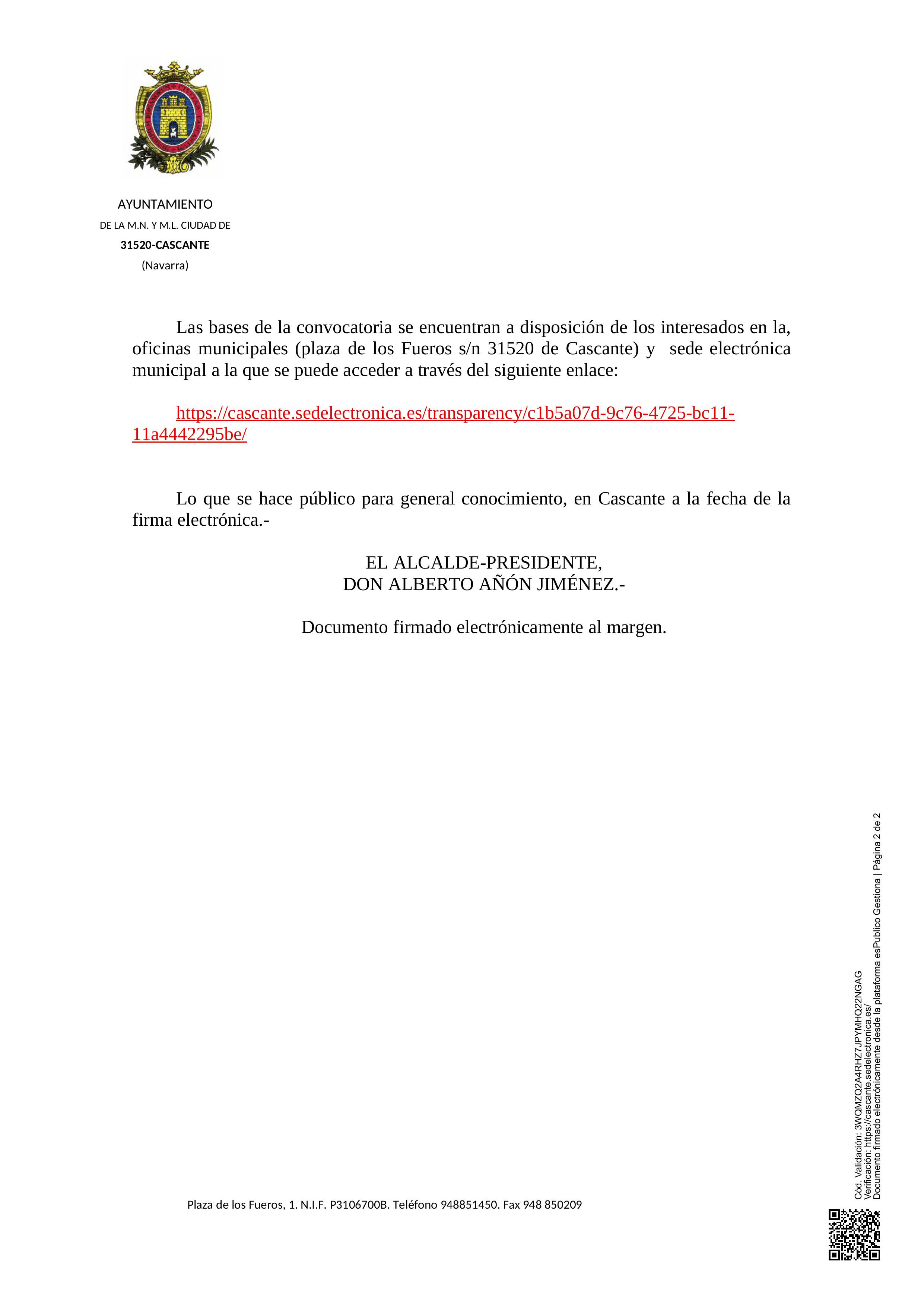 Las bases de la convocatoria se encuentran a disposición de los interesados en las oficinas municipales (plaza de los Fueros s/n 31520 de Cascante) y sede electrónica municipal a la que se puede acceder a través del siguiente enlace: https://cascante.sedelectronica.es/transparency/c1b5a07d-9c76-4725-bc11-11a4442295be/