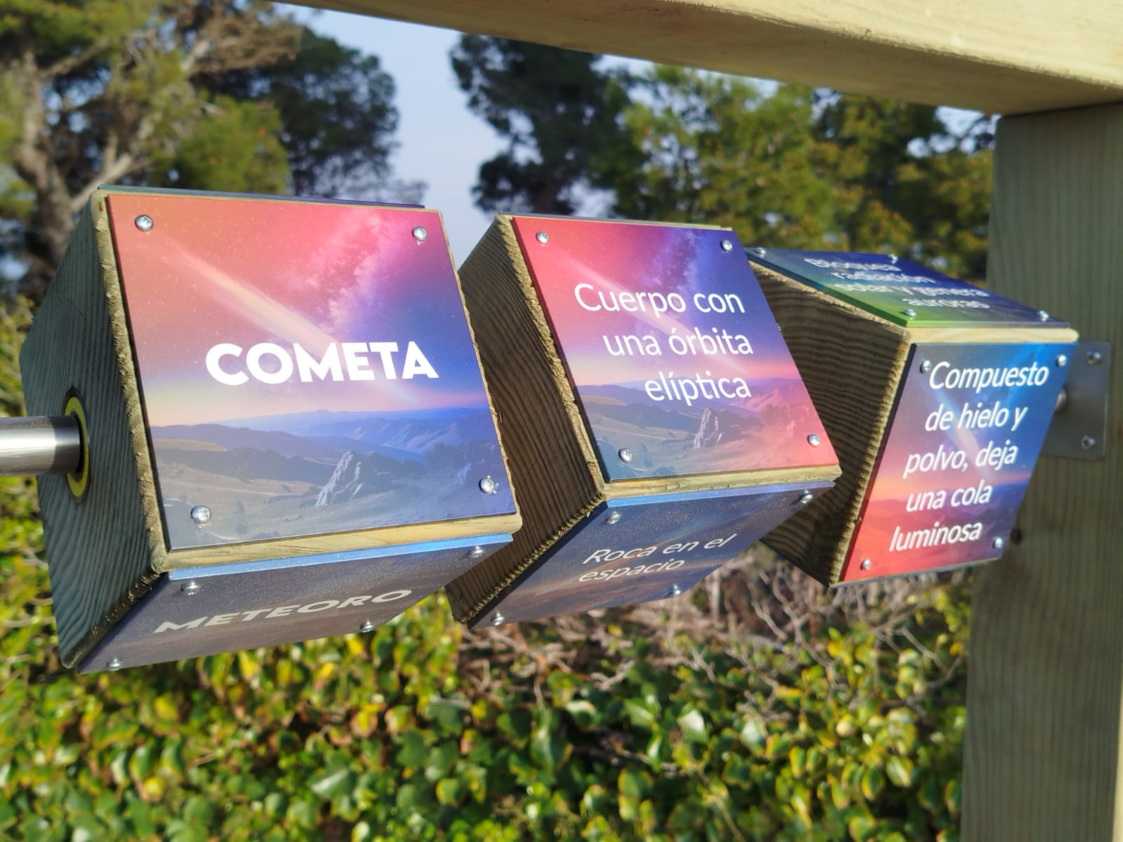 Cuenta con dos tumbonas de madera que facilitan la observación, así como varios paneles explicativos y de juegos, además de una señal que nos indica el punto de visión de la Estrella Polar.