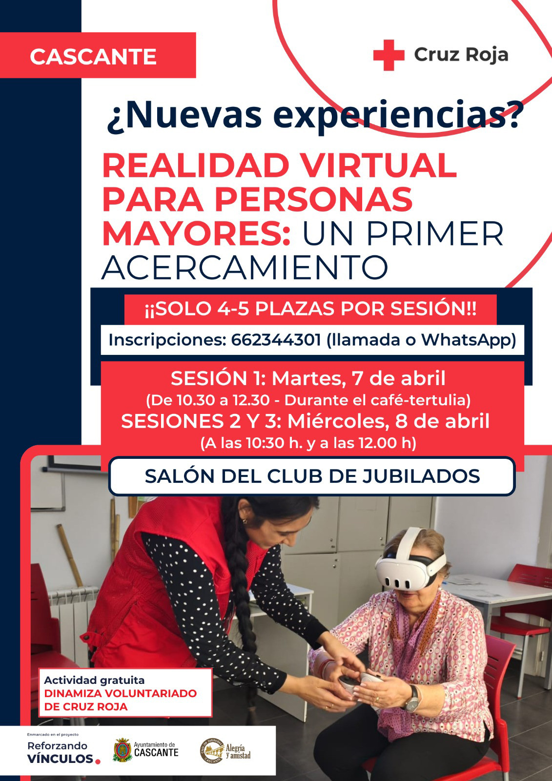 En Cruz Roja en Cascante facilitamos la inclusión tecnológica de las personas mayores a través de la Realidad Virtual. Los días 7 y 8 de abril, con el acompañamiento permanente de voluntariado, habilitamos varias plazas para conocer este recurso y los emocionantes y divertidos momentos que puede brindarnos.