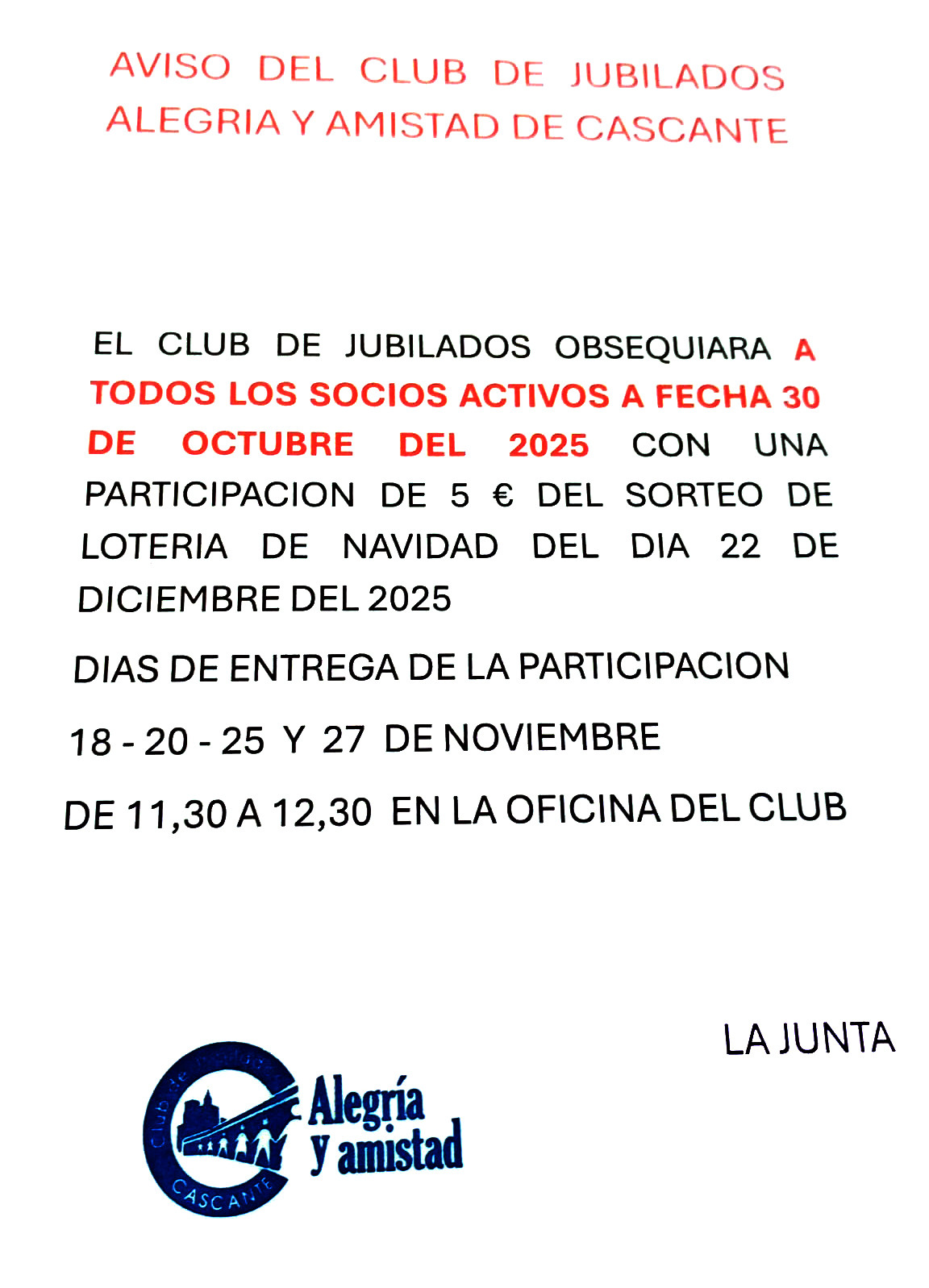 Todos los socios y socias activos a fecha 30 de octubre de 2025, serán obsequiados con 5 euros para el sorteo de la Lotería de Navidad del 22 de dicie...